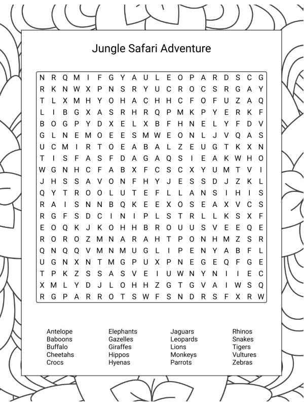 Pinte agora a página de Caça-palavras de safári na selva. Ou escolha entre as outras 9 páginas de divertidas em desenhocolorir.com.br.
